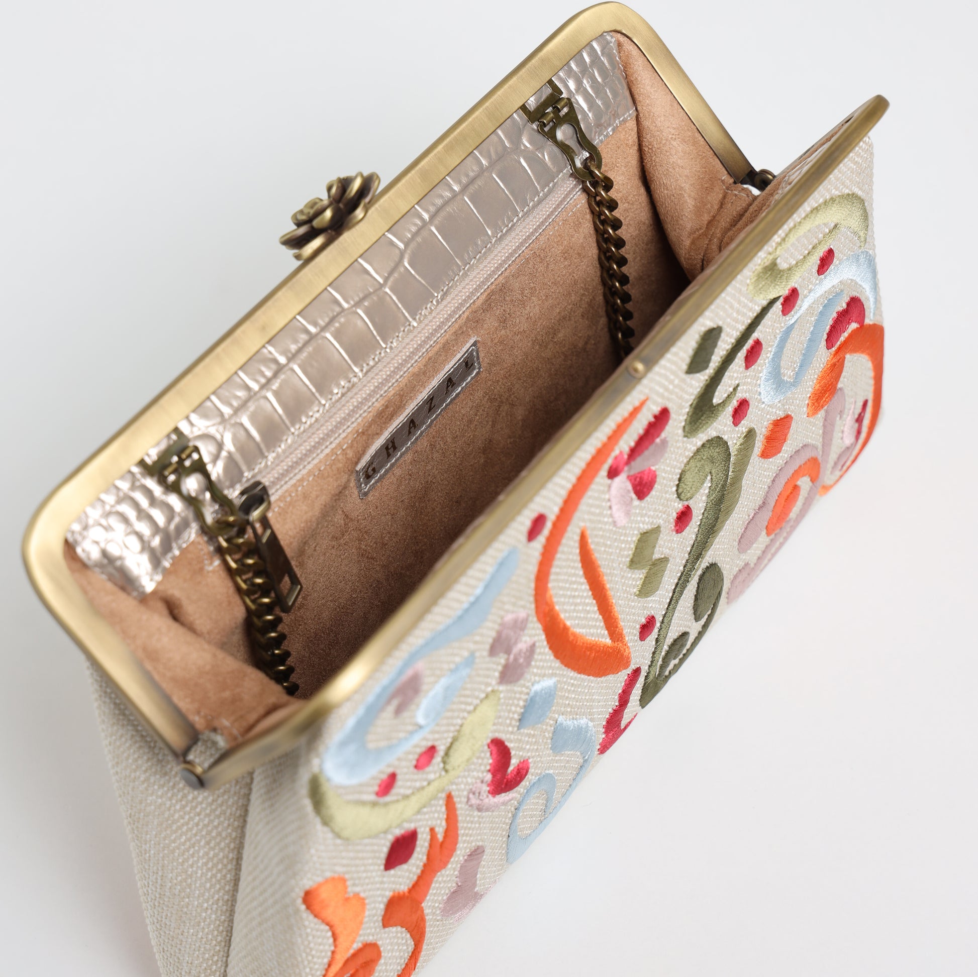 FLORAL DIWANI CLUTCH carries a random designed arabic letters, hand-crafted in elegant and timeless colored embroidery.