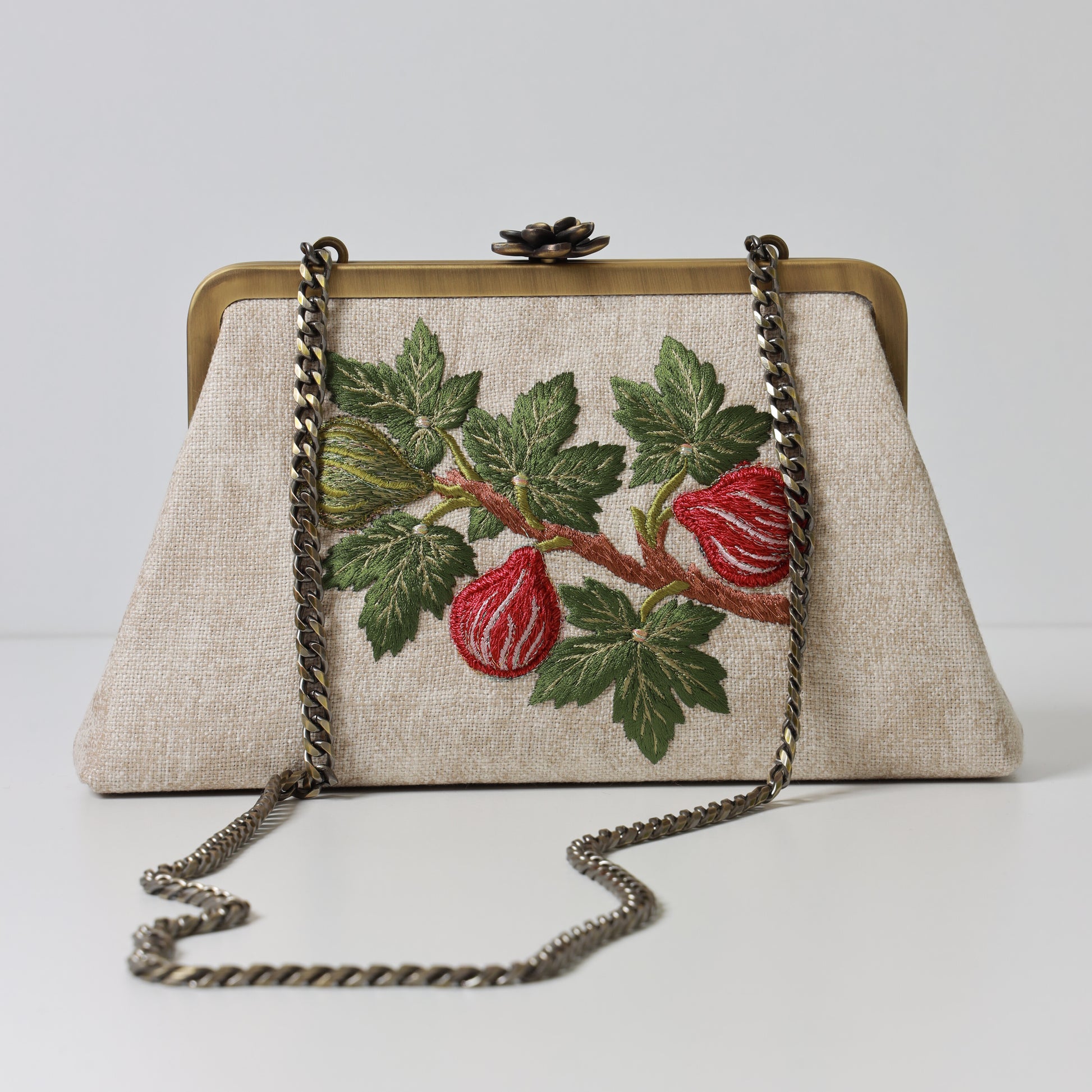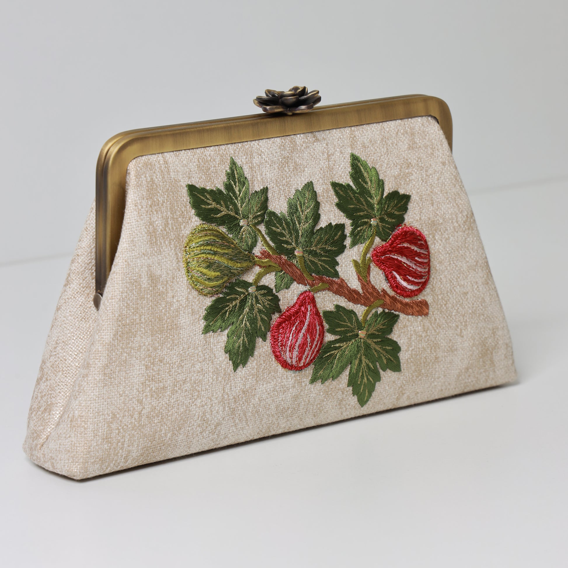 FIGS AND OLIVES CLUTCH clutch inspired by the Mediterranean heritage, this clutch features figs and olives, a verse from the holy Quran, symbols of abundance ,peace and prosperity. The clutch is two sided 3D embroidered one side figs and other side olives.