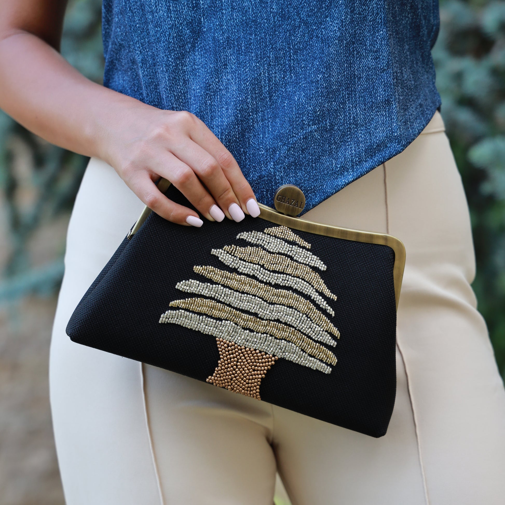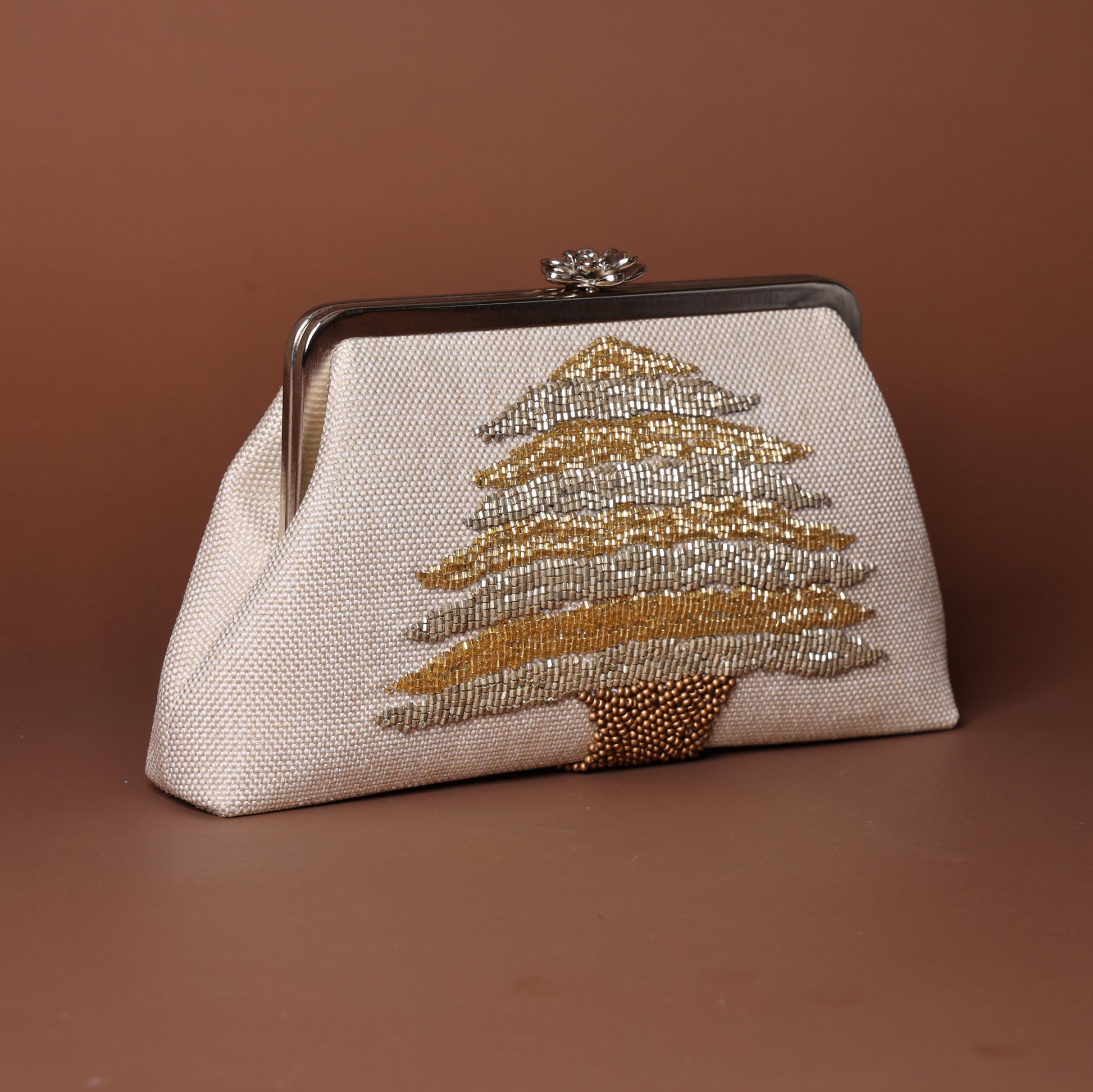 CEDAR CLUTCH is a statement of refined elegance. Inspired by the timeless beauty of cedar tree it's flawless craftsmanship makes it the ultimate companion for sophisticated evenings and chic occasions. Designed with precision and attention to details this clutch will always remind you of your lebanese roots.