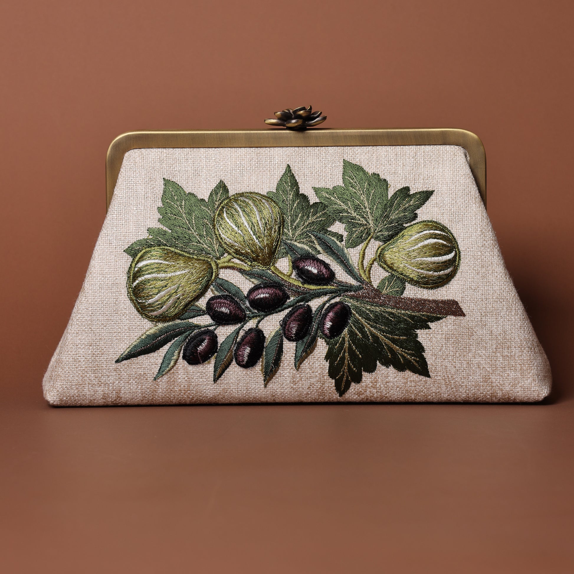 FIGS AND OLIVES CLUTCH clutch inspired by the Mediterranean heritage, this clutch features figs and olives, a verse from the holy Quran, symbols of abundance ,peace and prosperity. The clutch is two sided 3D embroidered one side figs and olives and phrase "والتين والزيتون" on the other side.