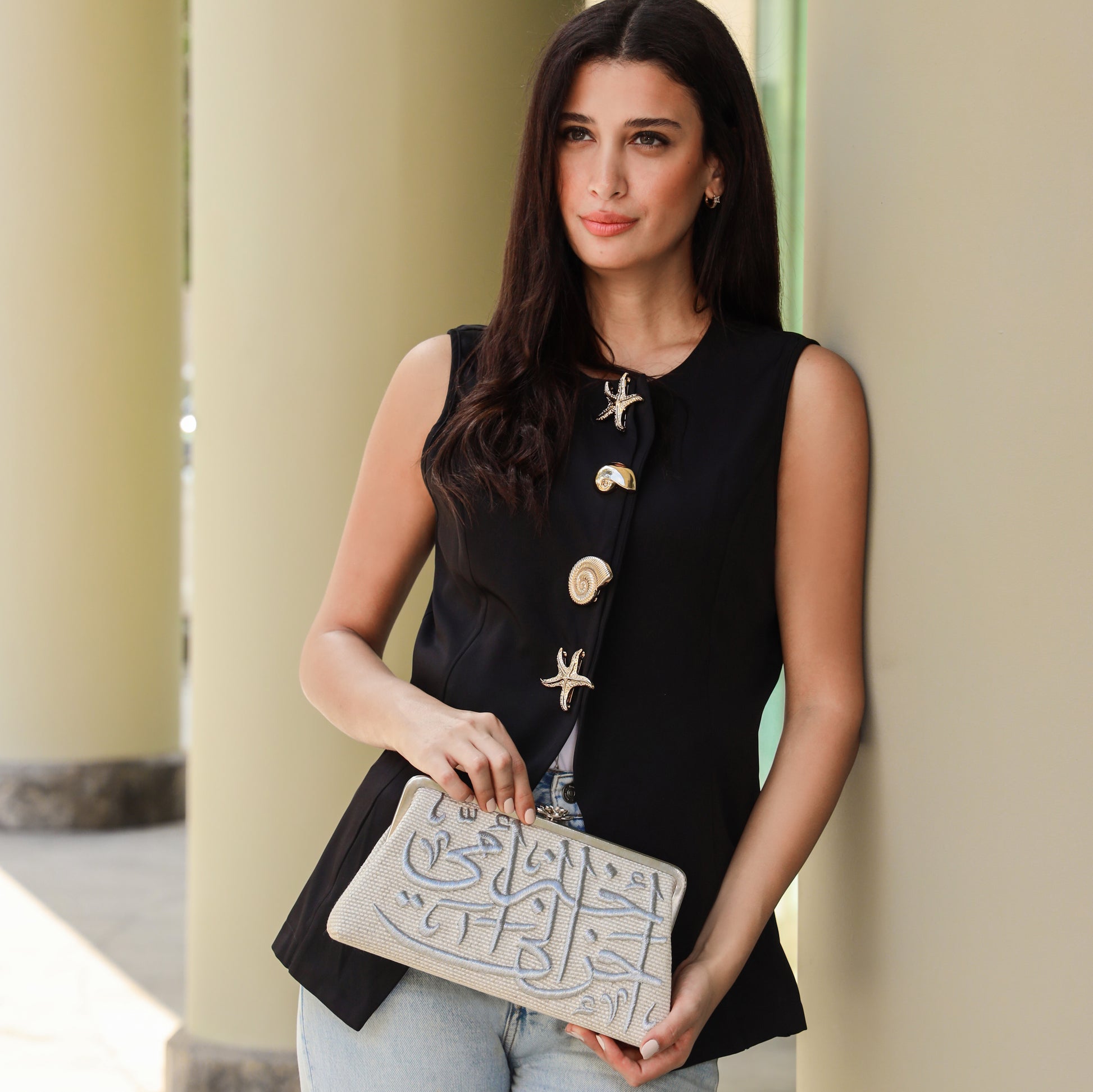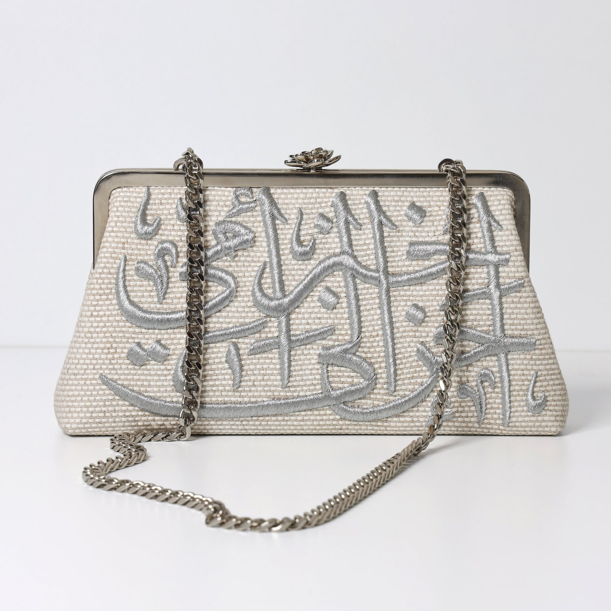 This unique clutch is designed for the most precious person-your mother. It is intricately embroided with the wonderful phrase,'أحن الى خبز امي'. It serves as a memorable gift she can proudly use for ant party or event.