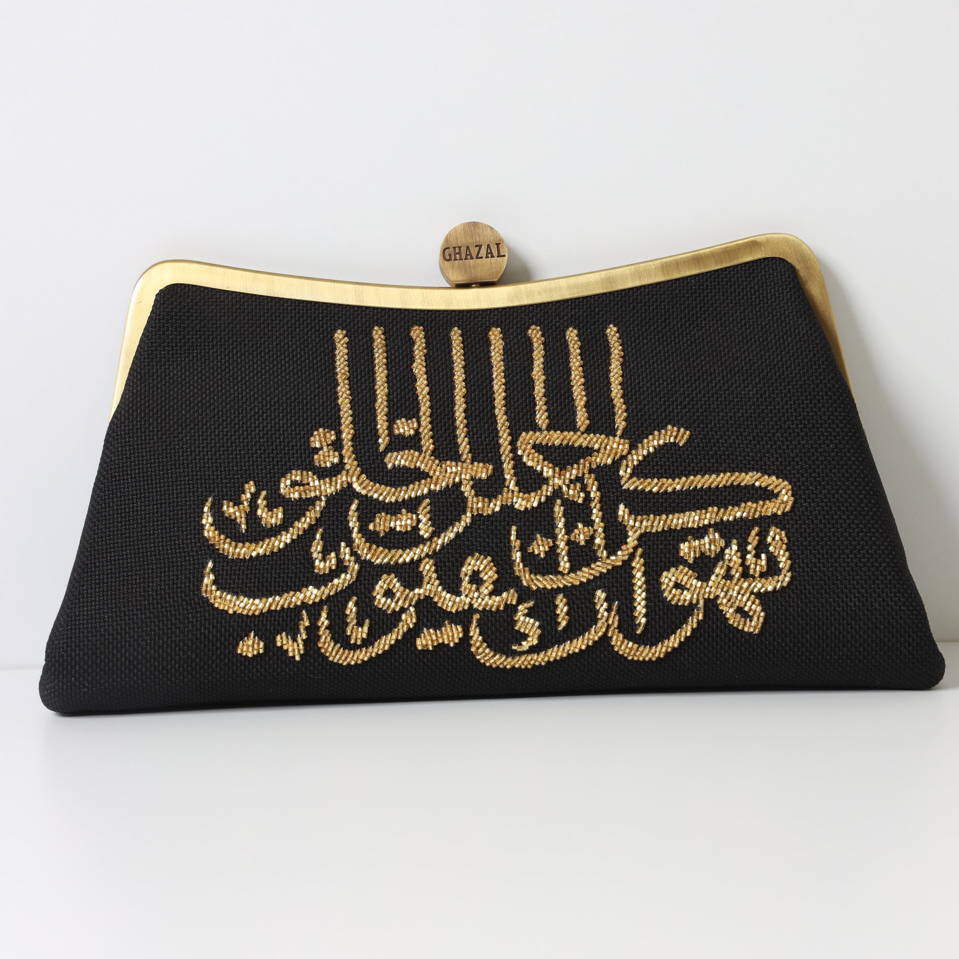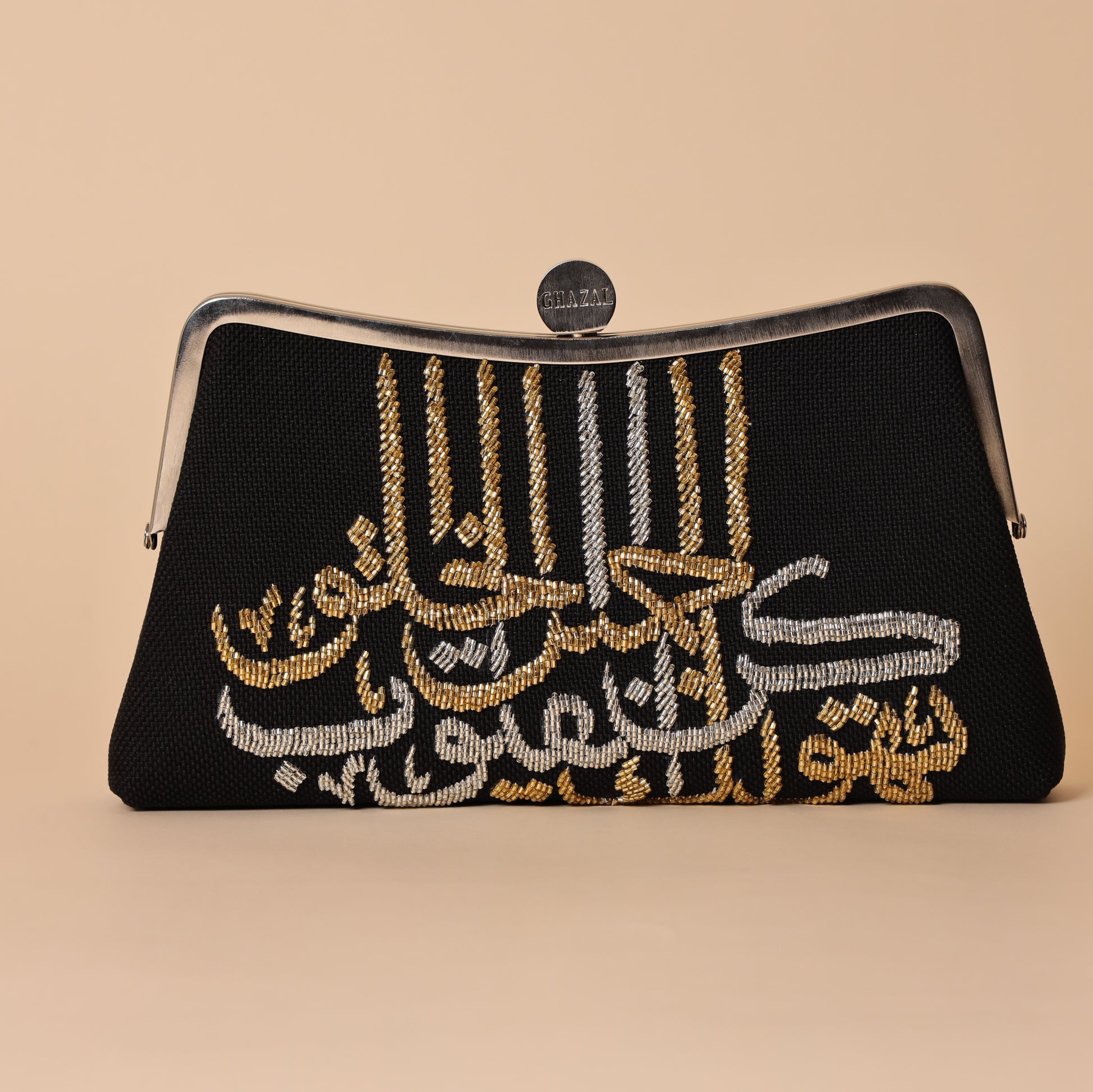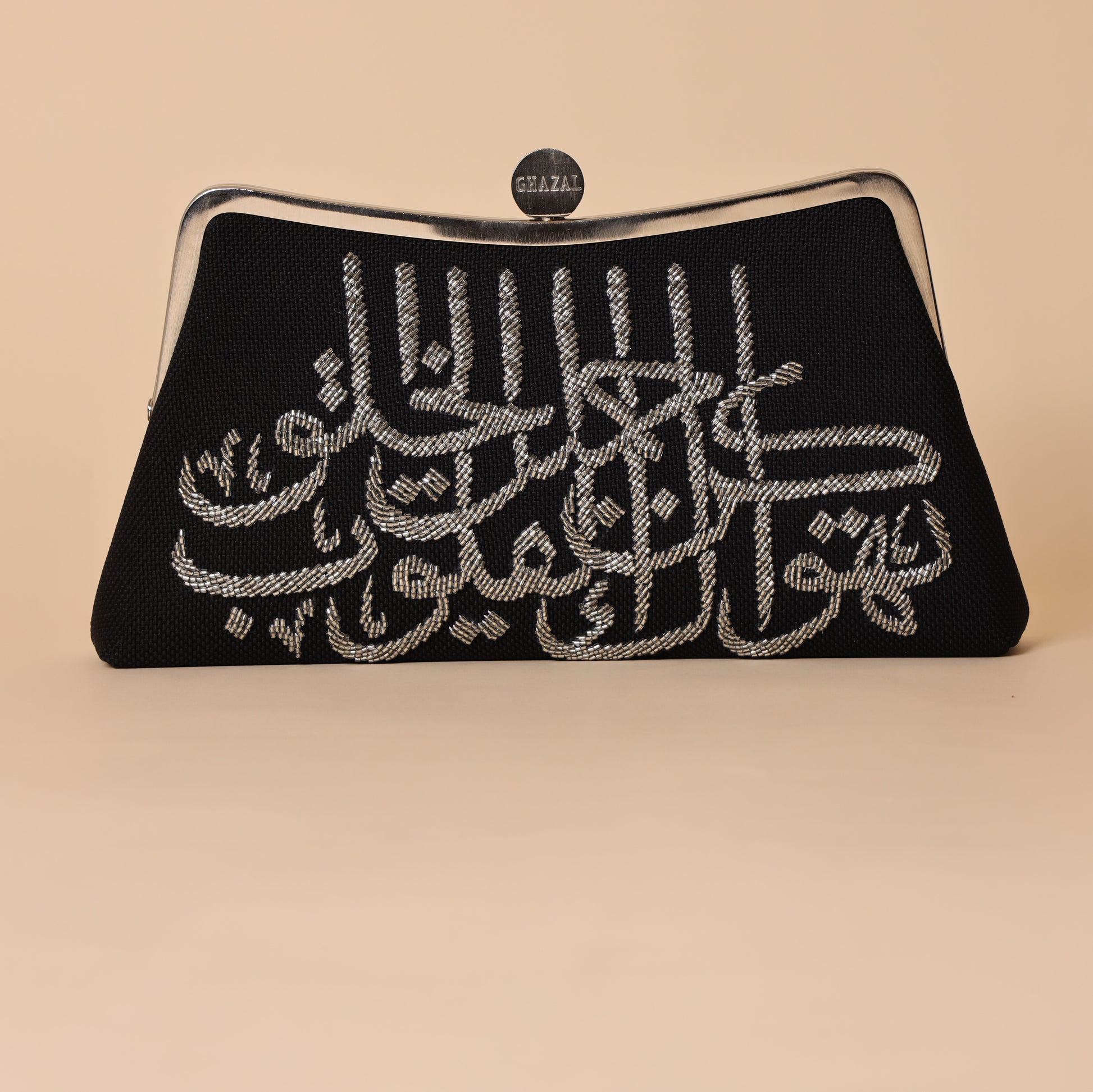 This is an elegant and distinctive evening clutch. The entire front surface is heavily embellished with intricate hand-beadwork. The beadwork forms a phrase in beautiful Arabic calligraphy. The specific message translates to: 'Be beautiful in character and hearts will adore you'. This uplifting and deep message makes the bag a unique wearable piece of art.