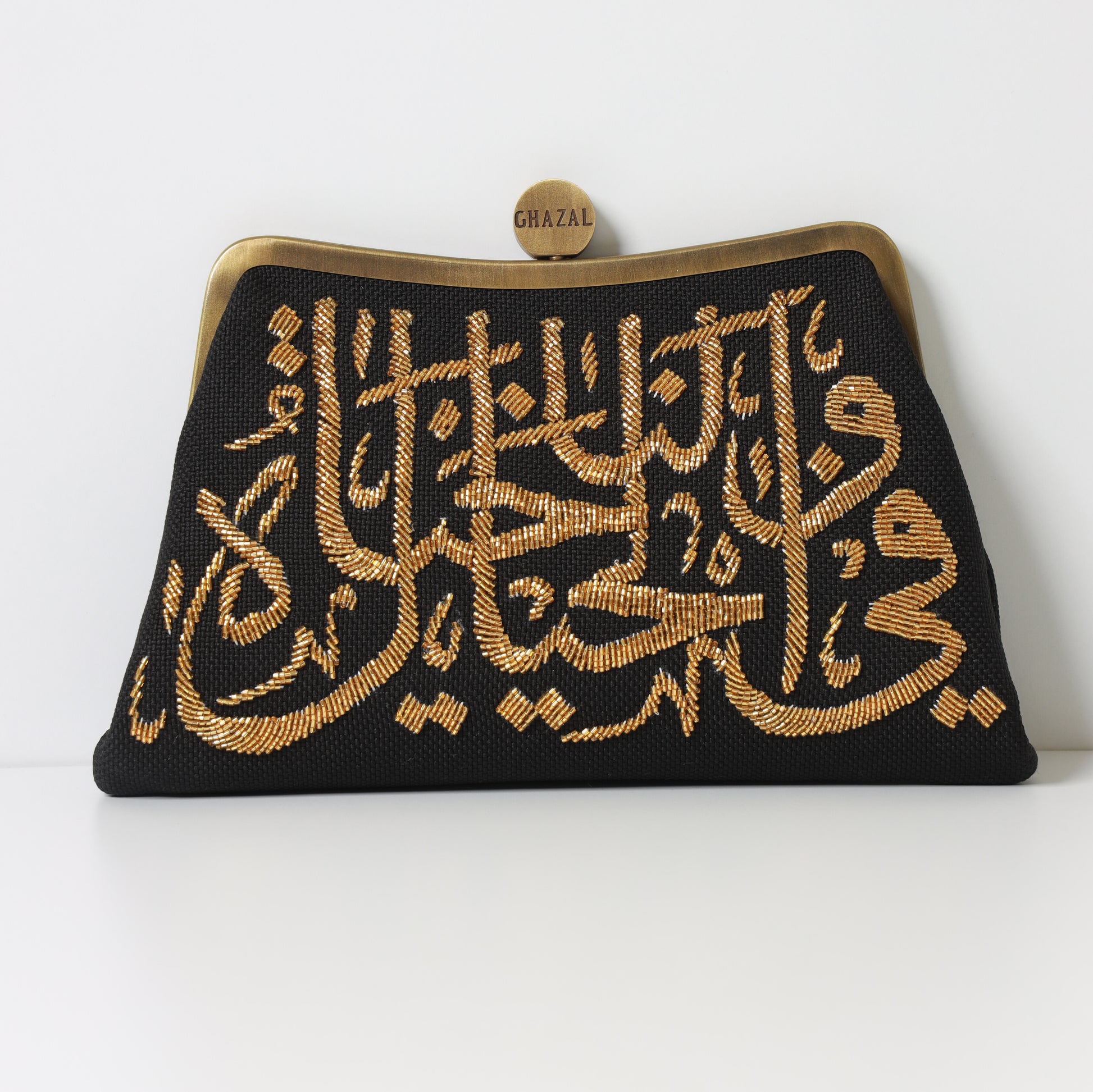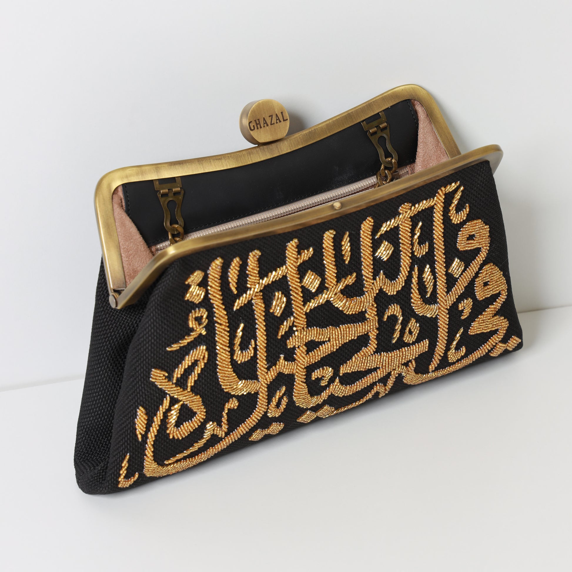 This clutch is an elegant and highly decorative bag, distinguised by its intricate beaded Arabic calligraphy. It holds a lovely message that immagination has no limits, it carries a new life.