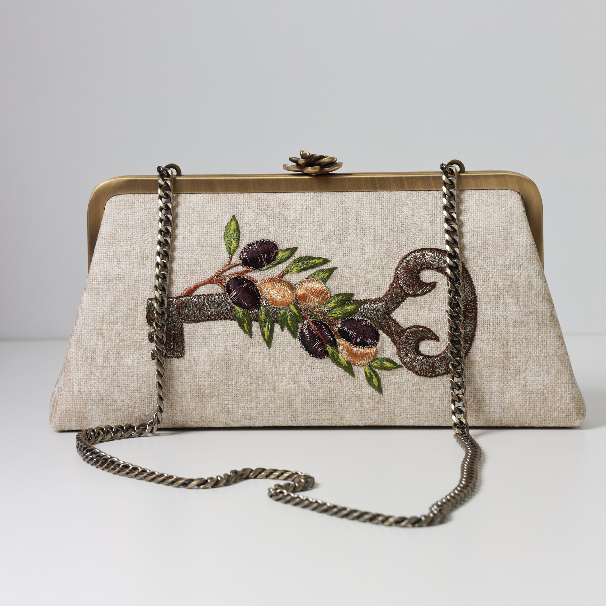 This clutch is a sentimental clutch featuring on one side the return key with a branch of olives that represents returning to the roots, embroidered in 3D effect by hands of high skilled artisans, and on the other side the word palastenian in arabic.